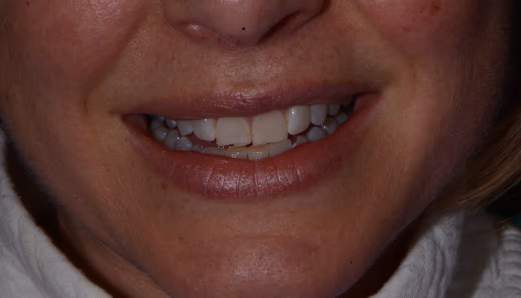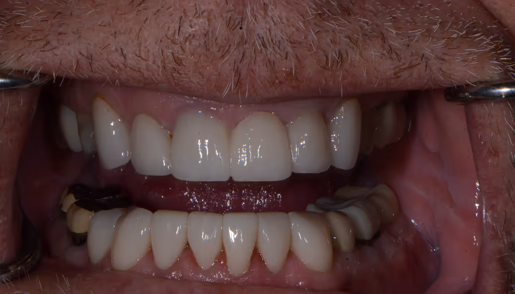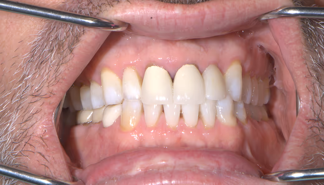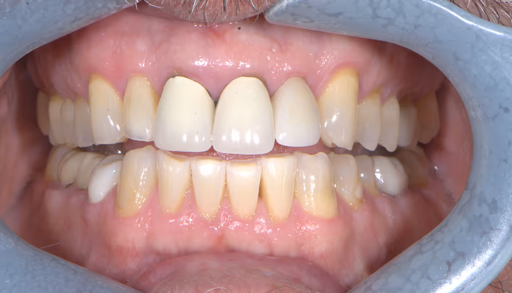 Heavily worn, dark and crooked teeth; restored with lab-made restorations to improve esthetics and tooth alignment/positioning